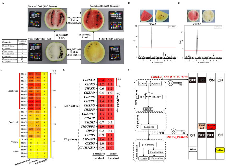 Watermelon fruit flesh displays various colors. Although genetic loci underlying these variations are identified, the molecular mechanism remains elusive. The research team assembled a chromosome-scale reference genome of an elite watermelon and developed integrated genetic maps using single nucleotide polymorphism and structural variation markers. Through systematic integration of dual genetic loci, they confirmed the molecular mechanism underlying watermelon flesh color differentiation. Four phenotypically distinct flesh colors in various watermelon accessions arise through coordinated action of two regulators: Lycopene β-Cyclase (ClLCYB) determines which type of carotenoid (yellow vs. red), while REDUCED CHLOROPLAST COVERAGE 2 (ClREC2) modulates the level of red carotenoid (coral red vs. scarlet red). The new insights offer valuable guidance and advance our understanding of carotenoid biosynthesis and accumulation in plants.