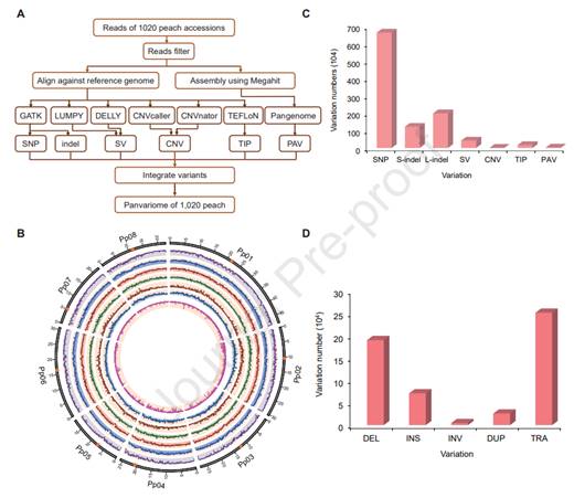 Leveraging genome resequencing data from 1,020 peach germplasm accessions, the team systematically identified all known DNA variant types, including single nucleotide polymorphisms (SNPs), small insertions/deletions (indels), structural variations (SVs), copy number variations (CNVs), transposable element insertion polymorphisms (TIPs), and presence/absence variations (PAVs). The resulting pan-variome atlas revealed that 70.6% of variants were novel. Additionally, a pan-genome map of the 1,020 accessions uncovered 3,289 genes absent in the reference genome. Comparative analysis of gene counts across taxa demonstrated a significant gene gains during peach domestication, contrasting with patterns observed in other plants and suggesting extensive gene introgression during peach evolution. Phylogenomic reconstruction traced global dissemination routes, revealing that almond contributed to the formation of wild P. davidiana, with P. miraidentified as the most probable wild progenitor of cultivated peach. Furthermore, P. kansuensis was found to play a key role in the genetic architecture of P. ferganensis.