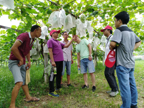 支部一行首先来到大营乡的一处果园,该园区主要种植有葡萄和苹果,由于管理上的问题,葡萄去年冻死了不少,陈锦永和程大伟同志在仔细观察询问,了解情况后,建议管理上要及时打梢,不再施氮肥,后期喷施几次钾肥促进枝条老化,同时,冬季做好埋土防寒,以免再次受冻,损失更大。高登涛和司鹏针对苹果存在的问题,分别讲解示范了刻芽、拉枝及果园生草管理技术和省力化施肥技术,涂洪涛和乔成奎就病虫害防治及果品安全方面的注意事项进行了讲解。随后大家来到位于建设路南的葡提缘家庭农场葡萄园,该园管理水平较好,大家查看了不同品种的长势及成熟情况,就生产中出现的问题同管理人员进行了探讨,并从销售策略上提出了一些建议,我所调控课题组提供的阳光玫瑰DBY管理技术在该园表现突出,得到了管理人员的盛赞,看到我所技术能够得到果农的认可,我们也感到很自豪。
