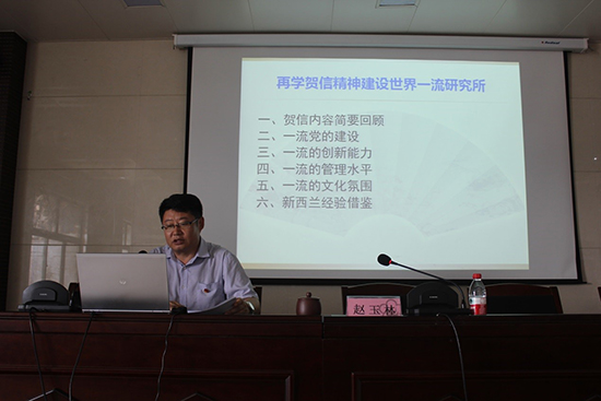 赵玉林以《再学贺信精神,建设世界一流研究所》为题,为广大党员上了一堂内容丰富的党课。他首先简要回顾了习近平总书记致建院60周年的贺信内容,围绕习近平总书记提出的建设世界一流学科、一流科研院所的奋斗目标,从一流党的建设、一流的创新能力、一流的管理水平、一流的文化氛围四个方面指出要全面加强党的建设,大力提升科技创新能力,全面提升管理水平,深入开展创新文化建设,明确指出了研究所的发展方向。他强调,党员同志们要培养树立大局和责任意识,要有强烈的爱国爱党情怀,继承老一辈科学家、老一辈党员们爱国奉献、淡泊名利的优秀品质,牢固树立创新科技、服务国家、造福人民的思想,培养创新思维,提高创新能力,积极投身农业科技事业。